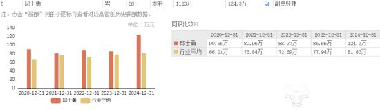 薪酬方面,邱士勇2024年薪酬為124.26萬元,較2023年的85.66萬元增加38.6萬元,增幅顯著,不過與同期公司高管的薪酬相比并不算高。