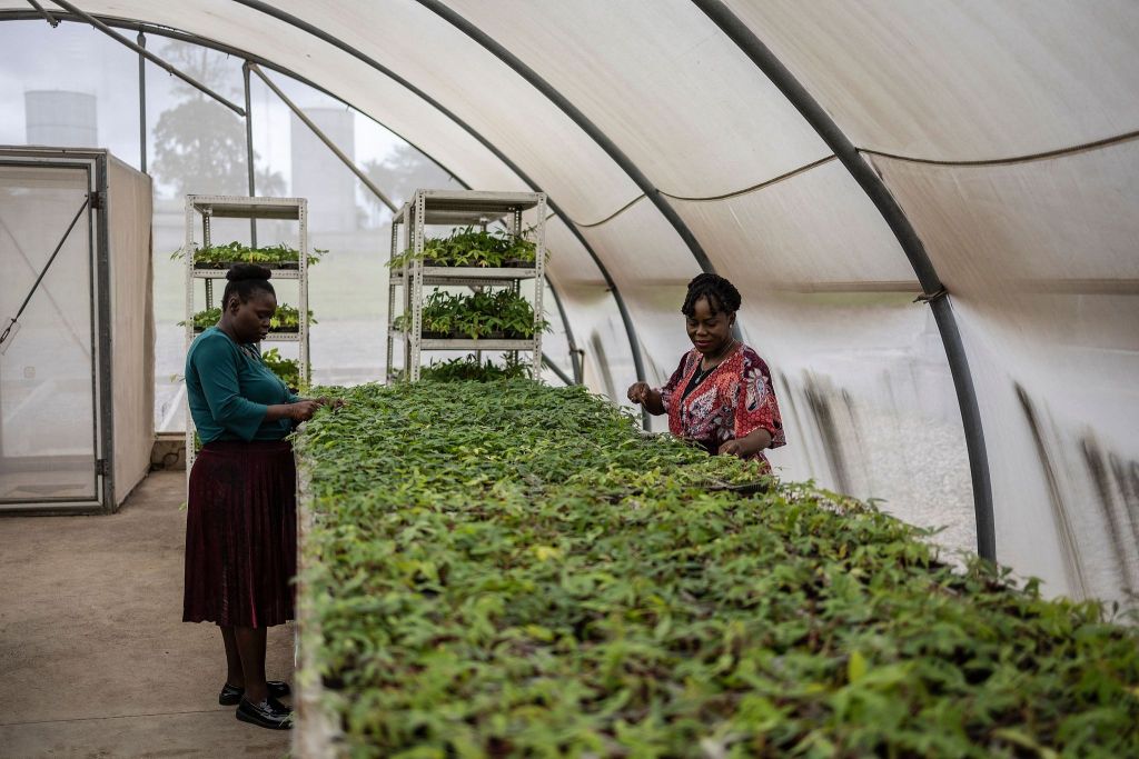 當(dāng)?shù)貢r(shí)間2025年9月29日,尼日利亞伊巴丹,國(guó)際熱帶農(nóng)業(yè)研究所(IITA)校園內(nèi),尼日利亞農(nóng)學(xué)家梅西·迪比魯-奧喬(右)與一名工人正在溫室里拔除木薯作物的雜草。迪比魯-奧喬致力于將尼日利亞山藥和木薯的產(chǎn)量提高500%,以對(duì)抗饑餓,并將該國(guó)在農(nóng)業(yè)價(jià)值鏈中的地位從單純的種植者提升為加工者。視覺中國(guó) 圖