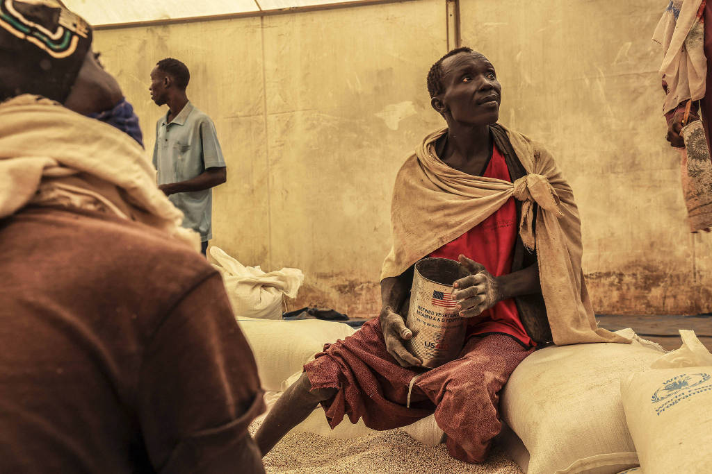 當(dāng)?shù)貢r(shí)間2025年8月20日,在南蘇丹馬班的難民營(yíng),聯(lián)合國(guó)世界糧食計(jì)劃署(WFP)分發(fā)糧食后,一名男子舀取小麥分發(fā)給其他等待的家庭。視覺中國(guó) 圖