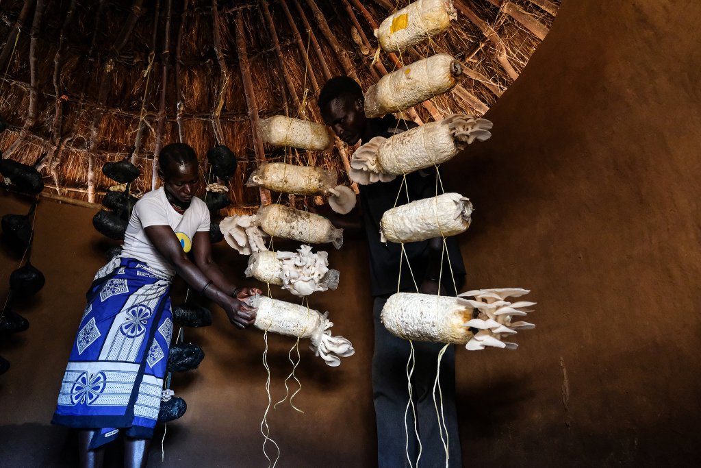 當(dāng)?shù)貢r(shí)間2025年7月23日,烏干達(dá)科蒂多區(qū),當(dāng)?shù)剞r(nóng)民正在查看他們的蘑菇農(nóng)場(chǎng)。聯(lián)合國(guó)世界糧食計(jì)劃署(WFP)正在卡拉莫賈地區(qū)推行生計(jì)多樣化,通過糧食系統(tǒng)方法改善民生。視覺中國(guó) 圖