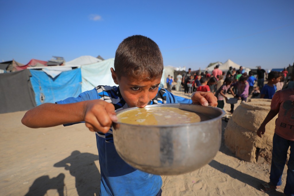 當(dāng)?shù)貢r(shí)間2025年9月29日,加沙地帶加沙城,努賽賴特難民營(yíng),由于沖突導(dǎo)致食物短缺,一名巴勒斯坦兒童領(lǐng)取免費(fèi)熱餐后開始享用。視覺中國(guó) 圖