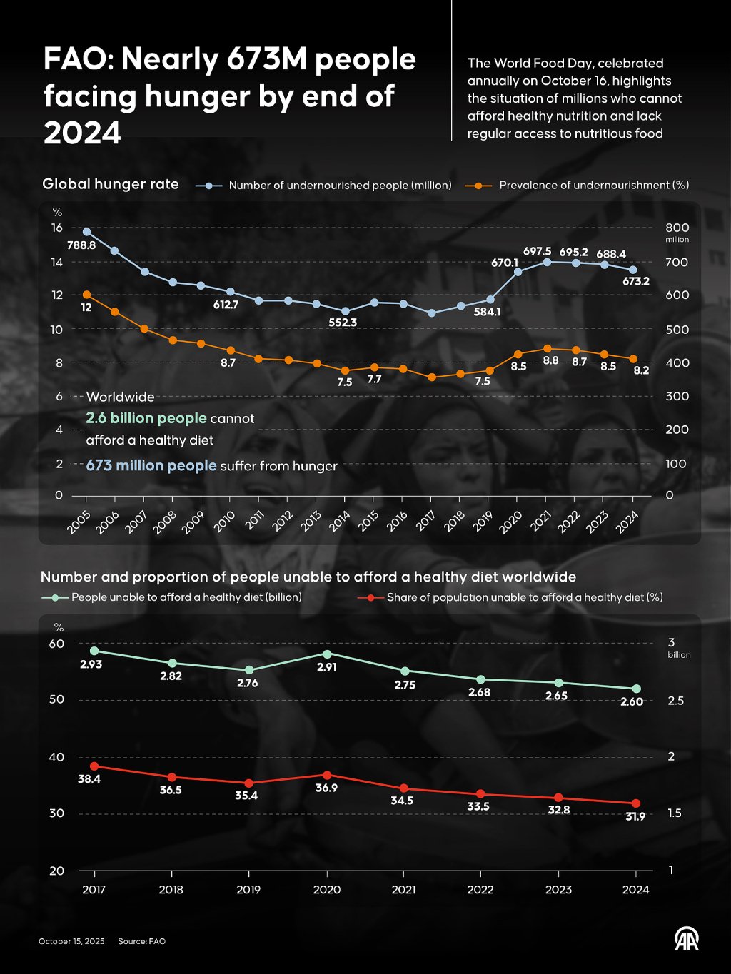 當(dāng)?shù)貢r(shí)間2025年10月15日,土耳其安卡拉,一張信息圖顯示“聯(lián)合國(guó)糧農(nóng)組織:到2024年底將有近6.73億人面臨饑餓”。視覺中國(guó) 圖