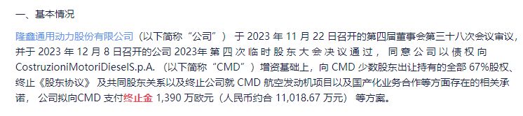 隆鑫通用還在2017年以4111萬歐元(約合人民幣3.04億元)收購意大利CMD公司67%的股權(quán)。然而,在意大利CMD公司未實(shí)現(xiàn)航空發(fā)動(dòng)機(jī)產(chǎn)品銷售、航空發(fā)動(dòng)機(jī)技術(shù)國產(chǎn)化計(jì)劃未達(dá)預(yù)期的情況下,隆鑫通用在2023年12月擬以100萬歐元(約合人民幣793萬元)價(jià)格轉(zhuǎn)讓意大利CMD公司67%股權(quán),同時(shí)支付1390萬歐元(約合人民幣1.10億元)的終止金,目前上述交易仍在推進(jìn)中。
