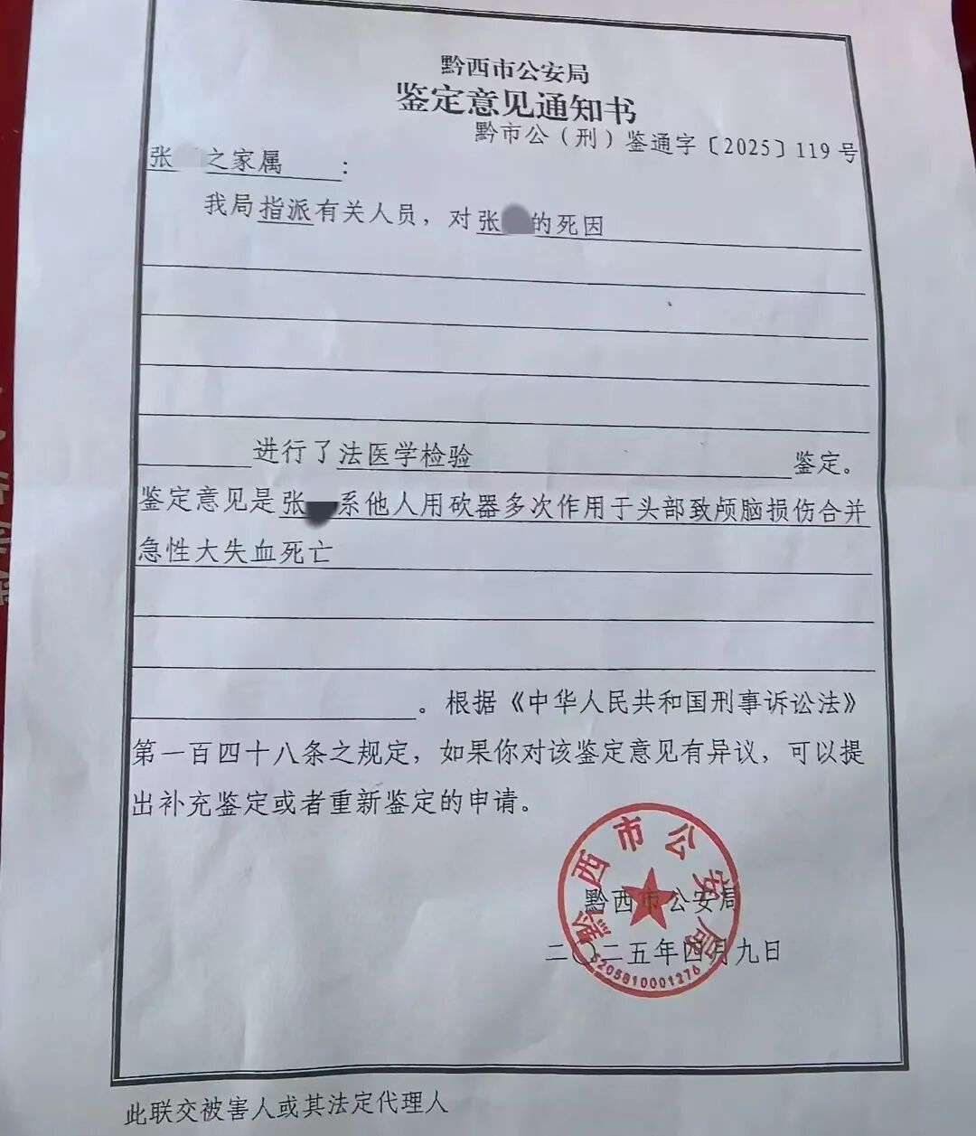 據(jù)陳女士提供的警方出具的鑒定意見書顯示,張某系他人用砍器多次作用于頭部致顱腦損傷合并急性大失血而死。