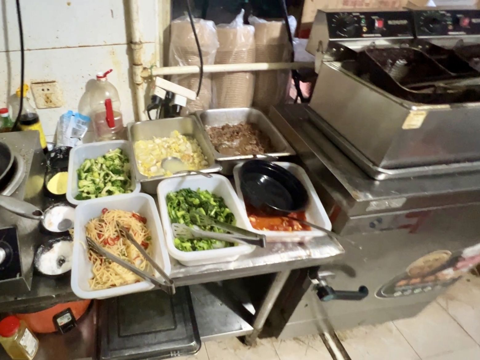 隔成九個(gè)外賣檔口,光小隔間店員徒手抓食物
