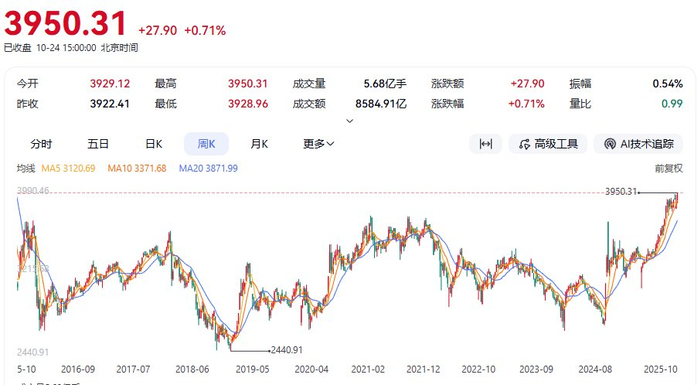10月24日,報(bào)收A股三大指數(shù)集體上漲。點(diǎn)創(chuàng)截至收盤(pán),年新上證指數(shù)報(bào)收3950.31點(diǎn),報(bào)收漲0.71%,點(diǎn)創(chuàng)刷新年內(nèi)新高。年新