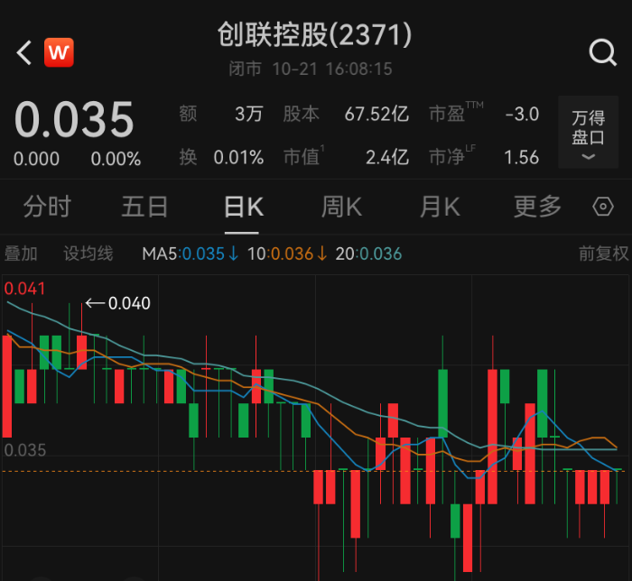 截至10月17日收盤,創(chuàng)聯(lián)控股股價(jià)僅0.035港元,總市值縮水至2.36億港元。