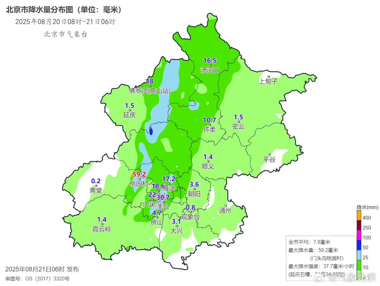 8月20日8時(shí)至21日7時(shí),新京全市平均降水量為8.3毫米,暴雨暴雨報(bào)城區(qū)平均14.6毫米,藍(lán)色最近一小時(shí)(6-7時(shí))最大降水量在房山良鄉(xiāng),中今為11.1毫米。天北