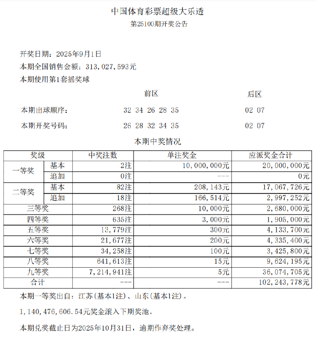 北京時(shí)間9月1日晚,體彩大樂(lè)透第25100期開(kāi)獎(jiǎng),獎(jiǎng)注獎(jiǎng)池當(dāng)期開(kāi)獎(jiǎng)號(hào)碼為前區(qū)26 28 32 34 35,落地后區(qū)02 07。余額億