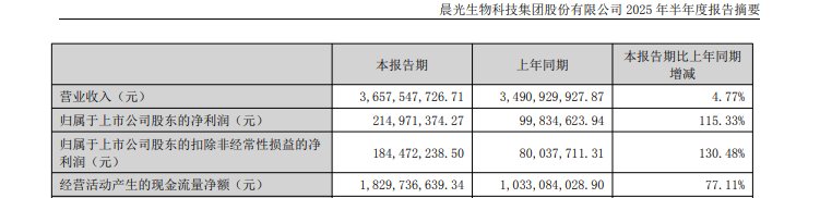 除此之外,在晨光生物2025半年度報告摘要中可以得知,2025上半年營業(yè)收入為36.58億元,同比增加4.77%,歸屬于上市公司股東的凈利潤為2.15億元,同比增加115.33%。