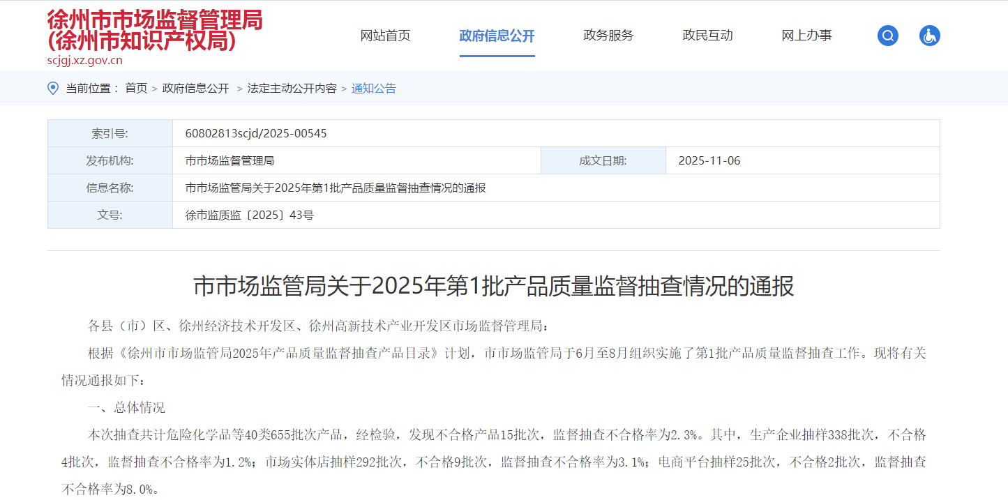 江蘇省徐州市市場(chǎng)監(jiān)管局發(fā)布2025年第1批產(chǎn)品質(zhì)量監(jiān)督抽查情況通報(bào)