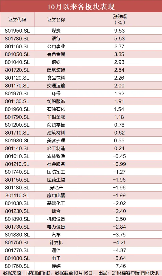 21財(cái)經(jīng)·南財(cái)快訊記者梳理發(fā)現(xiàn),10月以來(lái),銀行、煤炭板塊均已實(shí)現(xiàn)連續(xù)多日上漲,港口、白酒等板塊亦漲幅靠前;而電子、通信、汽車、計(jì)算機(jī)等板塊回調(diào)明顯,相較節(jié)前科技敘事帶動(dòng)股價(jià)大幅上漲的市場(chǎng)行情出現(xiàn)明顯的風(fēng)格切換。