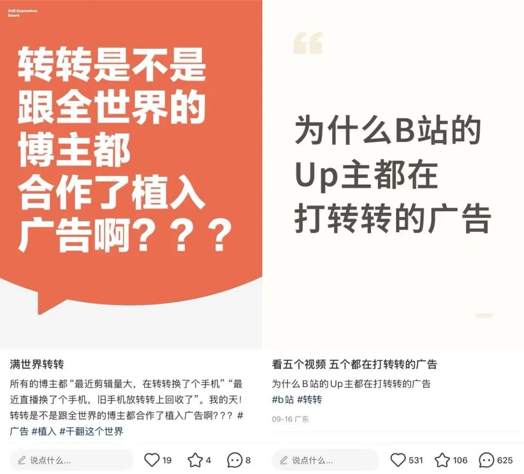 然而,頻繁切換賽道背后,轉(zhuǎn)轉(zhuǎn)始終未能建立起自身的“流量池”,依然需要外部供給。在B站、抖音平臺上,轉(zhuǎn)轉(zhuǎn)已經(jīng)成為了新晉“廣告金主”,被調(diào)侃“養(yǎng)活了大半個自媒體圈”,有短視頻平臺用戶吐槽:“轉(zhuǎn)轉(zhuǎn)是不是跟全世界的博主都合作了植入廣告?”