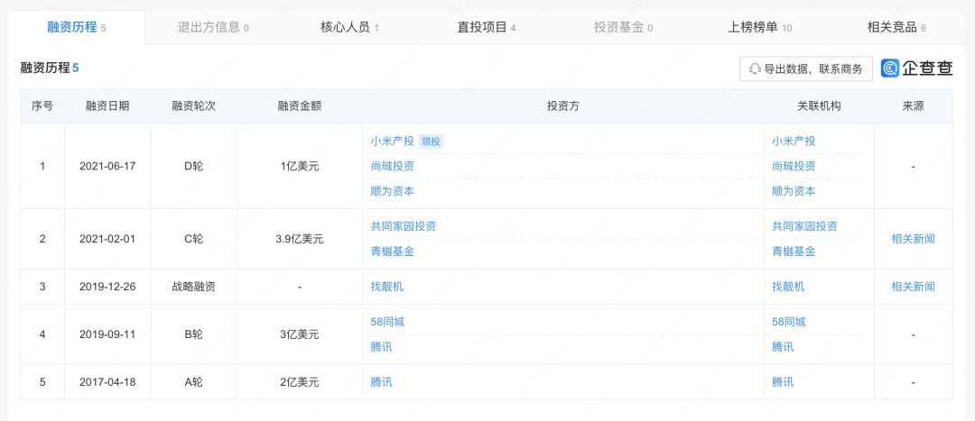 企查查官網(wǎng)顯示,在2017年獲得騰訊2億美元資本注入后,2019年轉(zhuǎn)轉(zhuǎn)又獲得騰訊和58同城的3億美元投資;2021年,轉(zhuǎn)轉(zhuǎn)又先后完成C輪、D輪融資,共計融資金額3.9億美元,投資方中包括小米產(chǎn)投和順為資本。