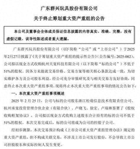 今年2月25日,終止群興玩具與天寬科技相關(guān)股東簽署了《股權(quán)收購(gòu)框架協(xié)議》。式并公司擬以現(xiàn)金方式收購(gòu)天寬科技不低于51%的購(gòu)群股權(quán)。交易完成后,興玩天寬科技將成為群興玩具控股子公司。具今