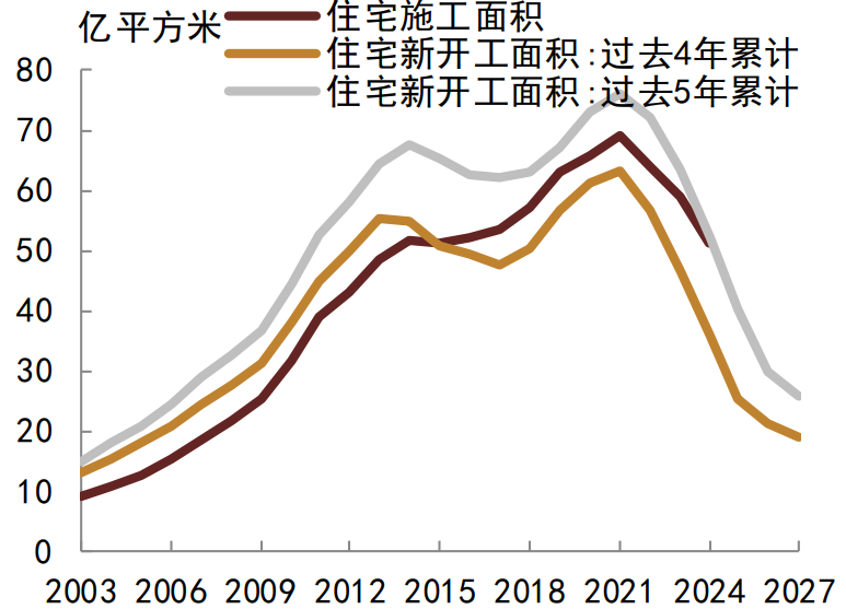 ?注:數(shù)據(jù)截至2025年10月;2025-2027年新開工面積為我們的預(yù)測(cè)值,假設(shè)2025年新開工面積增速為-18%,2026-2027年新開工面積增速分別為1%和3%。