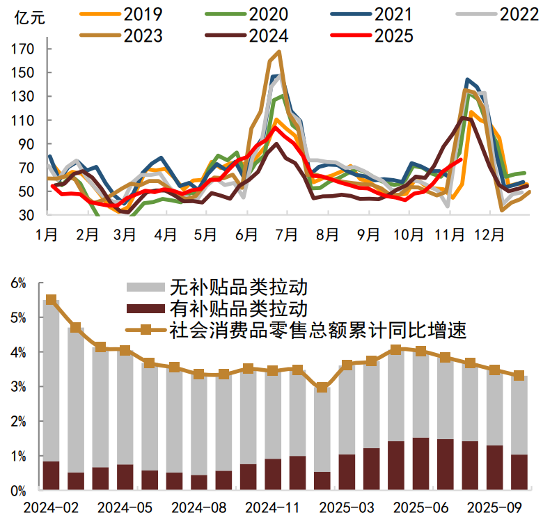 財(cái)政方面,四季度至明年初的財(cái)政赤字規(guī)模同比或有所回落,財(cái)政對(duì)實(shí)體經(jīng)濟(jì)的支持力度或趨于緩和。考慮到今年財(cái)政“靠前發(fā)力”的特征明顯,上半年政府債凈增量同比大幅增加,而下半年政府債凈增量同比則有所回落,其中三季度政府債凈增量同比略有回落,在政府赤字總規(guī)模相對(duì)確定的情況下,四季度政府債凈增量同比或?qū)⒊霈F(xiàn)較為明顯的回落(圖3)。同時(shí),對(duì)于明年的預(yù)算內(nèi)赤字水平,若我們假設(shè)2026年超長(zhǎng)期特別國(guó)債及專項(xiàng)地方債新增限額均僅較2025年小幅抬升、如分別較2025年增加0.2萬(wàn)億元和0.1萬(wàn)億元,那么2026年政府債券新增限額或在11.9萬(wàn)億元,疊加2.0萬(wàn)億元化債地方債,合計(jì)在13.9萬(wàn)億元左右,與2025年年初確定的13.86萬(wàn)億元政府債券新增限額基本持平。整體而言,四季度至明年初財(cái)政支持實(shí)體經(jīng)濟(jì)的力度或有所緩和,尤其是對(duì)消費(fèi)和基建方面增長(zhǎng)的承托效果可能會(huì)有所減弱。