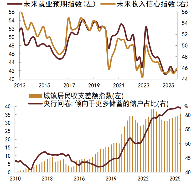 ?注:數(shù)據(jù)截至2025年三季度,下圖收支差額指數(shù)的計(jì)算方式為城鎮(zhèn)居民人均可支配收入和消費(fèi)支出以2010Q1定基為100,而后相減