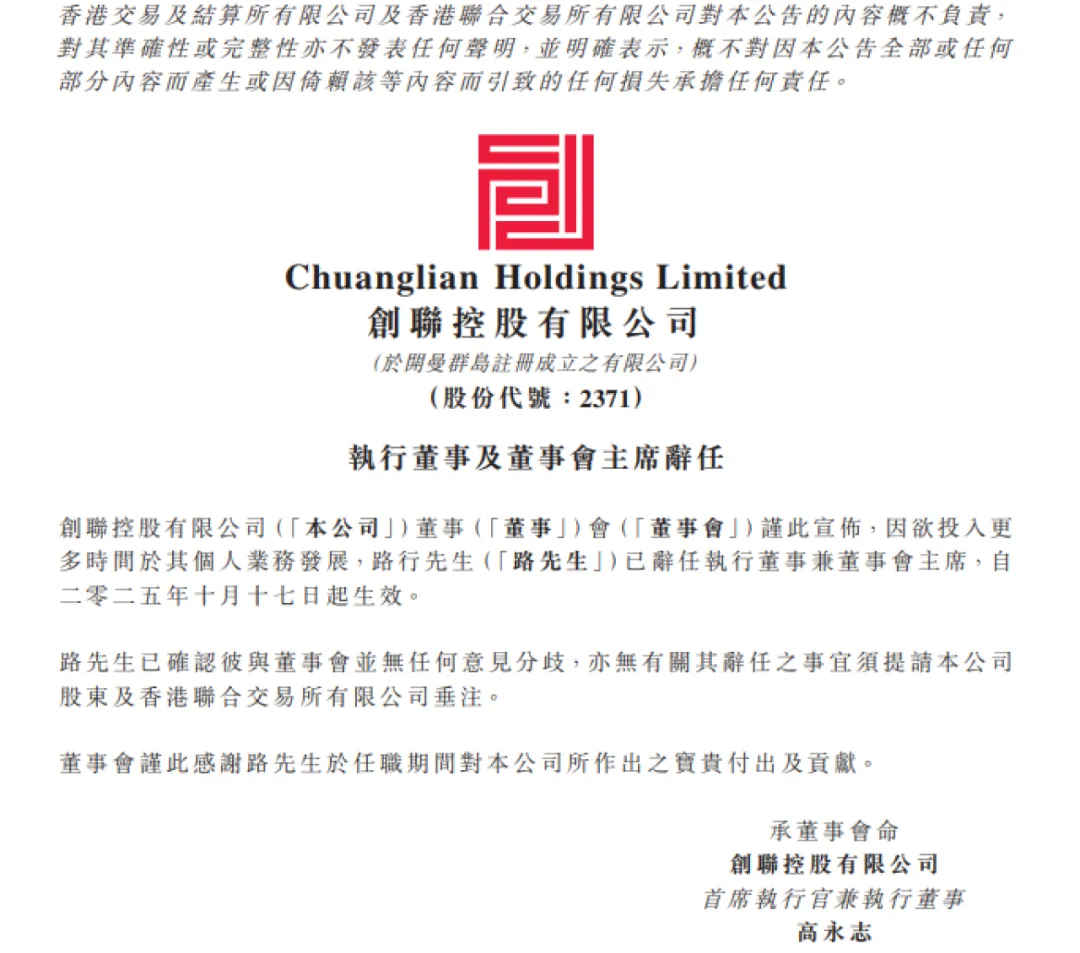 10月17日,創(chuàng)聯(lián)控股有限公司(創(chuàng)聯(lián)控股,02371.HK)公告執(zhí)行董事及董事會主席辭任。公告稱,路行因欲投入更多時間于其個人業(yè)務(wù)發(fā)展,已辭任創(chuàng)聯(lián)控股有限公司執(zhí)行董事兼董事會主席,辭任自2025年10月17日起生效。