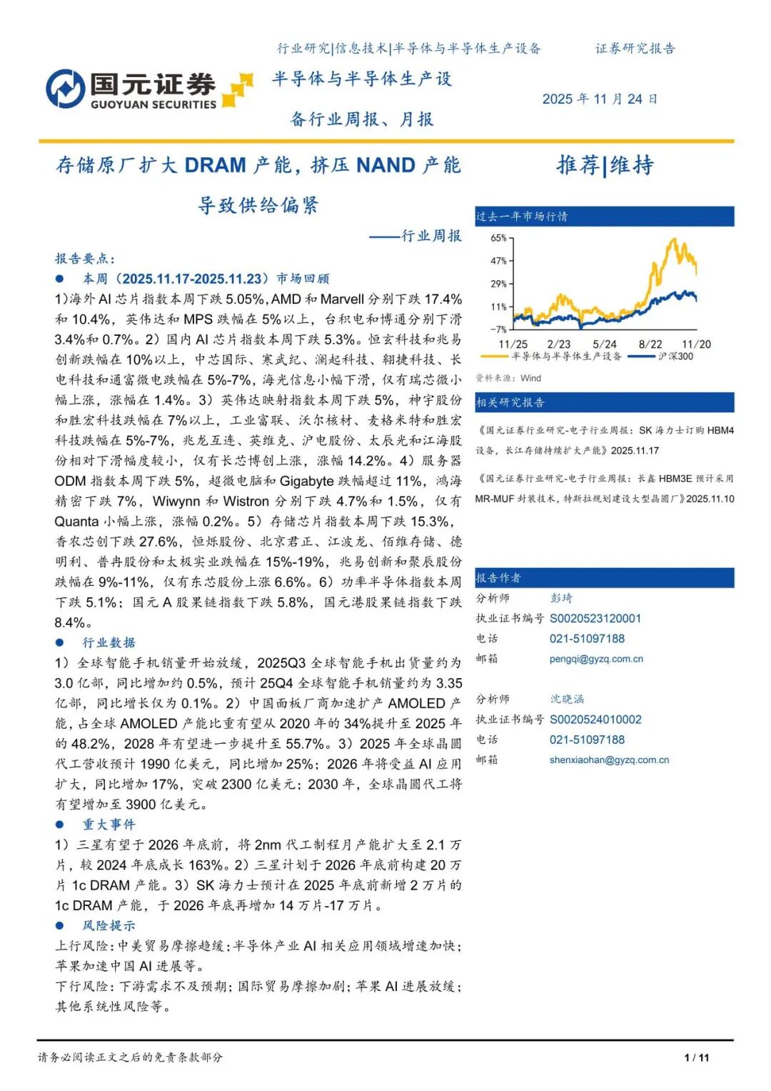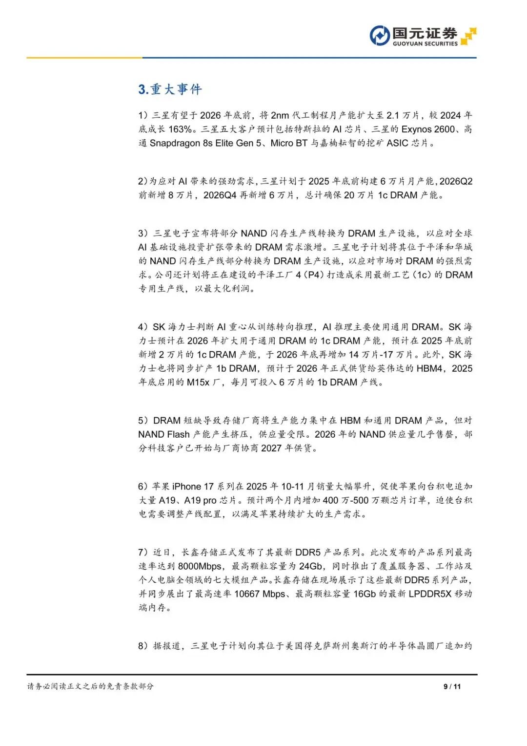 本報告摘自國元證券2025年11月24日已發(fā)布的《存儲原廠擴大DRAM產(chǎn)能,擠壓NAND產(chǎn)能導致供給偏緊——電子行業(yè)周報》,具體報告及分析內(nèi)容請詳見報告。若因?qū)蟾娴恼幍犬a(chǎn)生歧義,應以報告發(fā)布當日的完整內(nèi)容為準。