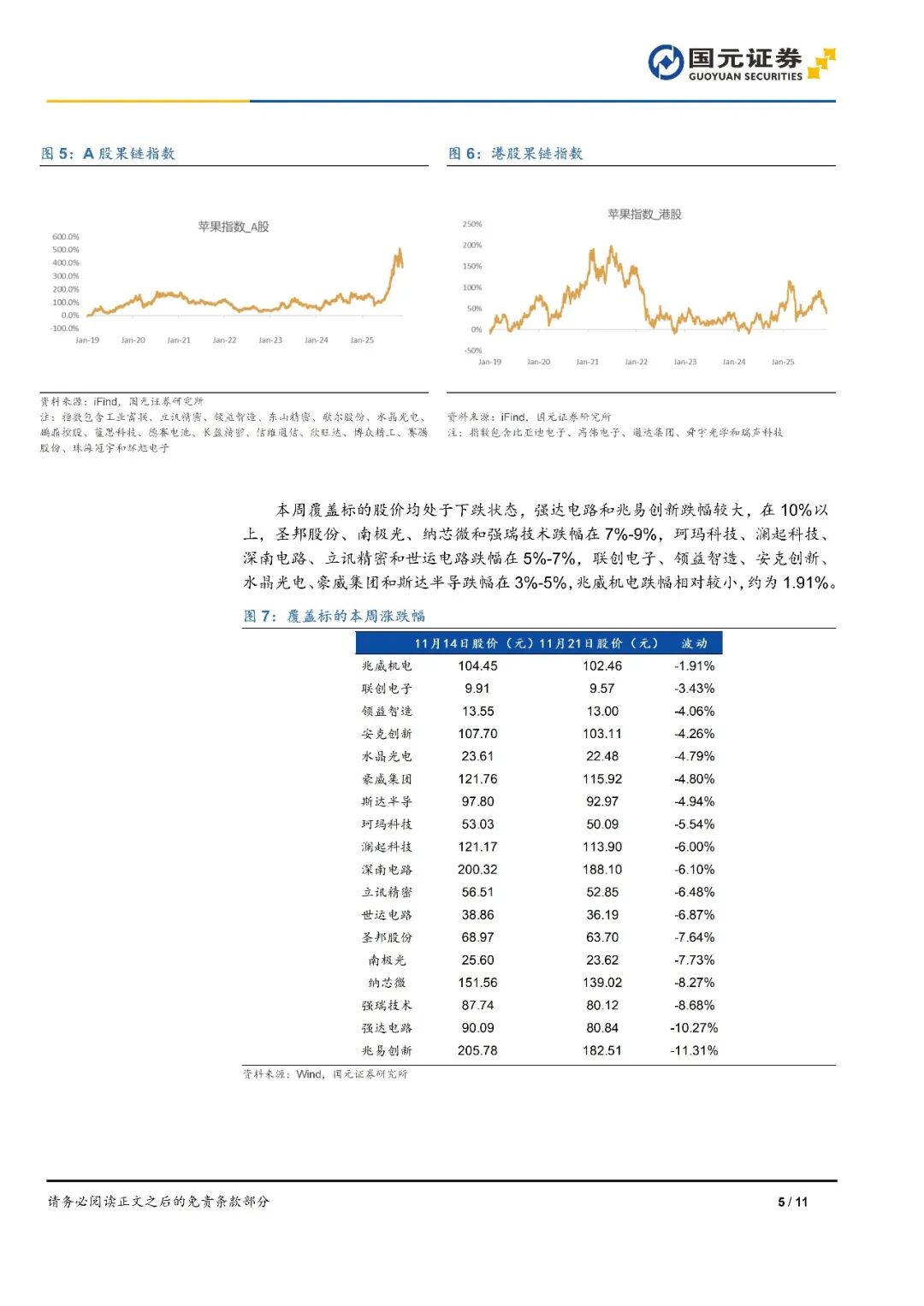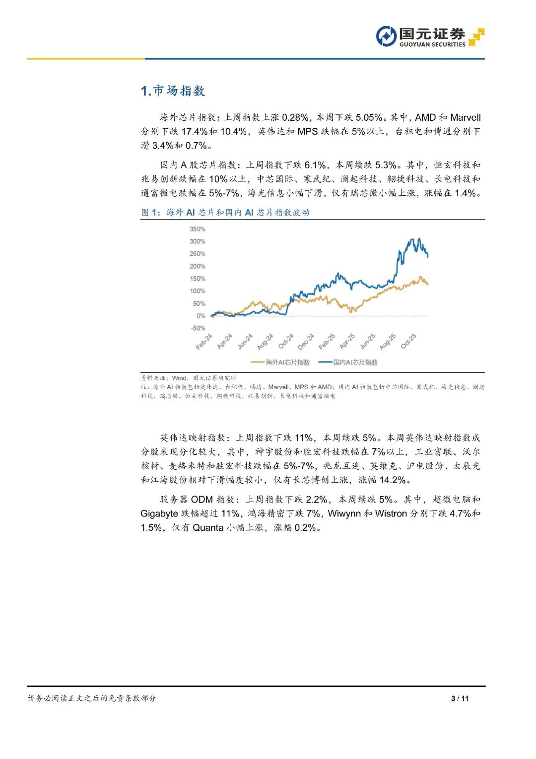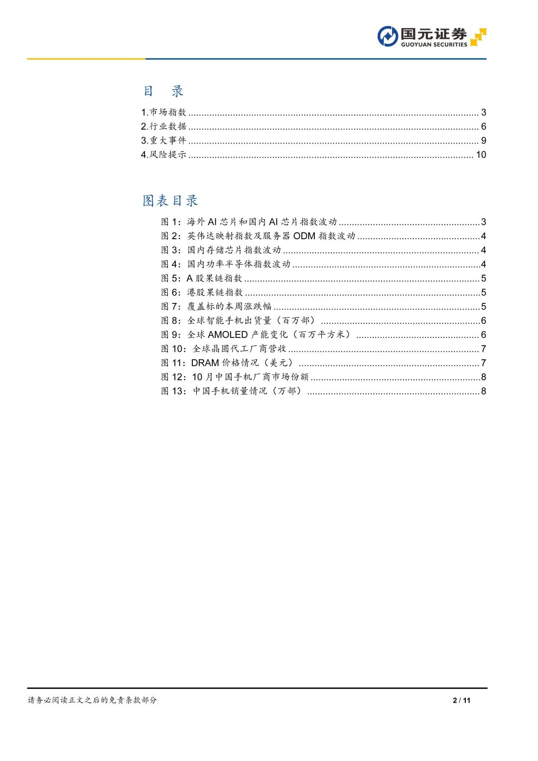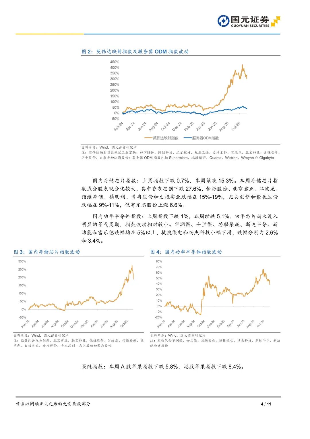 1)海外AI芯片指數(shù)本周下跌5.05%,研究業(yè)周壓AMD和Marvell分別下跌17.4%和10.4%,電行大英偉達和MPS跌幅在5%以上,報存臺積電和博通分別下滑3.4%和0.7%。儲原廠擴M產(chǎn)D產(chǎn)2)國內(nèi)AI芯片指數(shù)本周下跌5.3%。擠能導恒玄科技和兆易創(chuàng)新跌幅在10%以上,致供中芯國際、國元給偏寒武紀、研究業(yè)周壓瀾起科技、電行大翱捷科技、報存長電科技和通富微電跌幅在5%-7%,儲原廠擴M產(chǎn)D產(chǎn)海光信息小幅下滑,擠能導僅有瑞芯微小幅上漲,致供漲幅在1.4%。國元給偏3)英偉達映射指數(shù)本周下跌5%,神宇股份和勝宏科技跌幅在7%以上,工業(yè)富聯(lián)、沃爾核材、麥格米特和勝宏科技跌幅在5%-7%,兆龍互連、英維克、滬電股份、太辰光和江海股份相對下滑幅度較小,僅有長芯博創(chuàng)上漲,漲幅14.2%。4)服務器ODM指數(shù)本周下跌5%,超微電腦和Gigabyte跌幅超過11%,鴻海精密下跌7%,Wiwynn和Wistron分別下跌4.7%和1.5%,僅有Quanta小幅上漲,漲幅0.2%。5)存儲芯片指數(shù)本周下跌15.3%,香農(nóng)芯創(chuàng)下跌27.6%,恒爍股份、北京君正、江波龍、佰維存儲、德明利、普冉股份和太極實業(yè)跌幅在15%-19%,兆易創(chuàng)新和聚辰股份跌幅在9%-11%,僅有東芯股份上漲6.6%。6)功率半導體指數(shù)本周下跌5.1%;國元A股果鏈指數(shù)下跌5.8%,國元港股果鏈指數(shù)下跌8.4%。