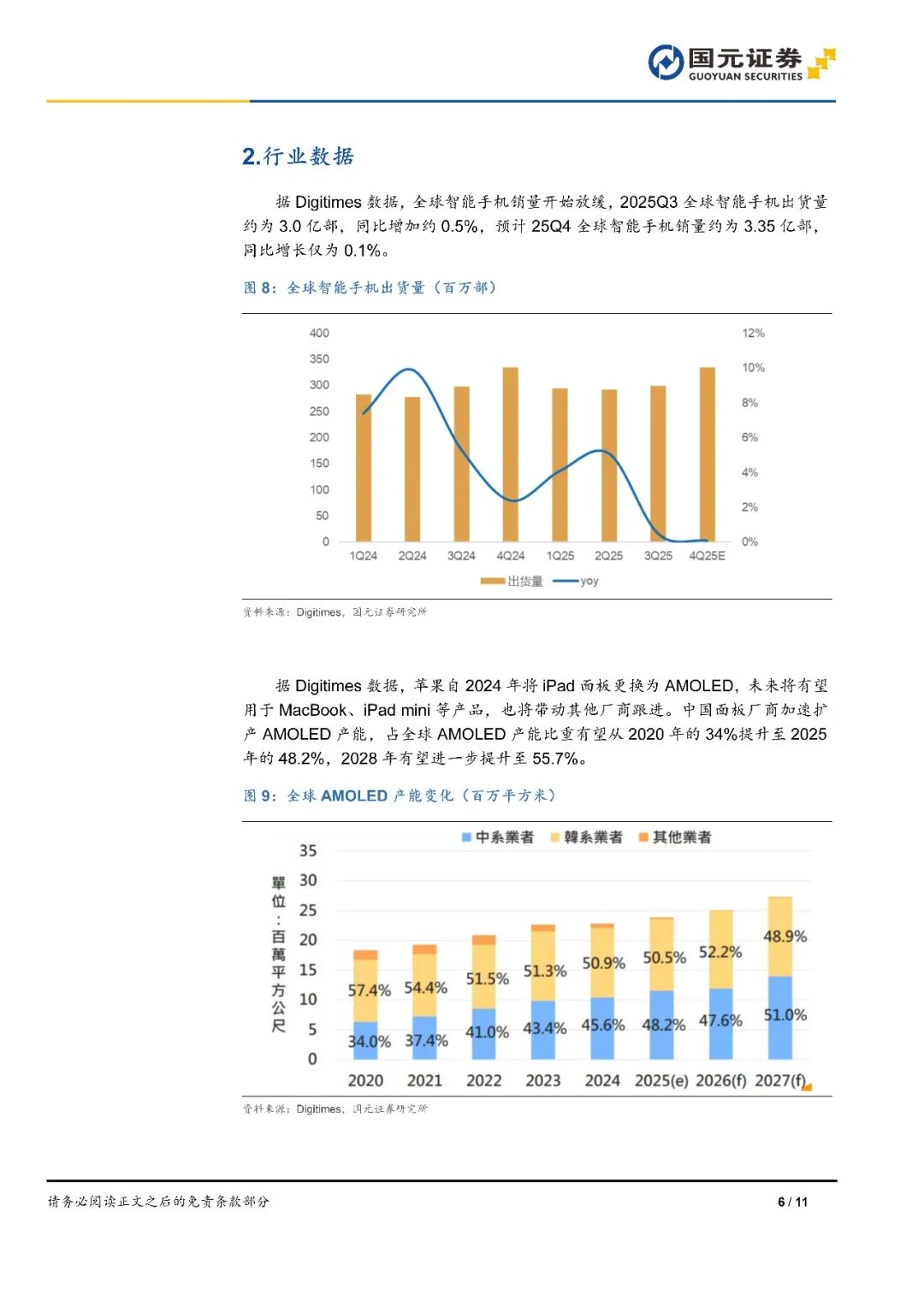 1)全球智能手機銷量開始放緩,2025Q3全球智能手機出貨量約為3.0億部,同比增加約0.5%,預計25Q4全球智能手機銷量約為3.35億部,同比增長僅為0.1%。2)中國面板廠商加速擴產(chǎn)AMOLED產(chǎn)能,占全球AMOLED產(chǎn)能比重有望從2020年的34%提升至2025年的48.2%,2028年有望進一步提升至55.7%。3)2025年全球晶圓代工營收預計1990億美元,同比增加25%;2026年將受益AI應用擴大,同比增加17%,突破2300億美元;2030年,全球晶圓代工將有望增加至3900億美元。