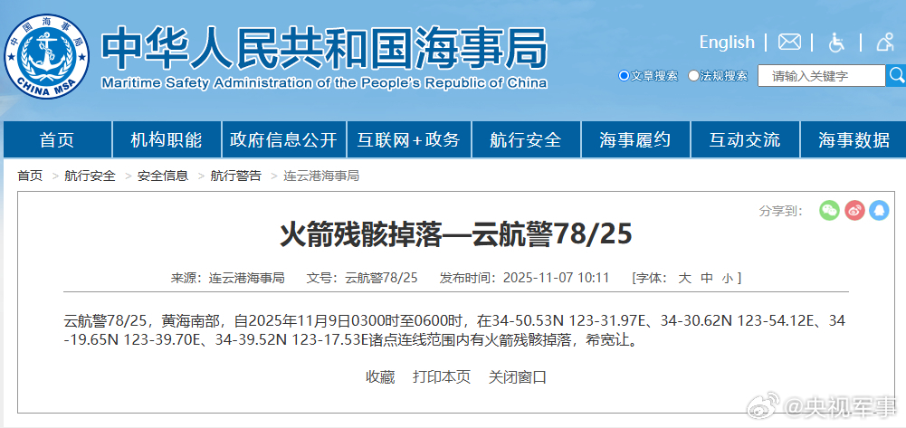 據(jù)中國海事局網(wǎng)站消息,連云港海事局發(fā)布航行警告,警告11月9日3時(shí)至6時(shí),南部黃海南部有火箭殘骸掉落。殘骸