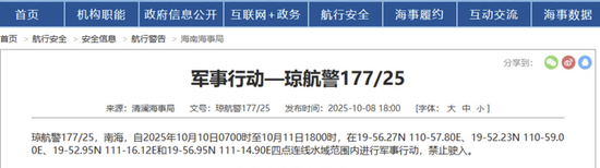 據(jù)中國海事局網(wǎng)站消息,航行海域清瀾海事局發(fā)布航行警告,警告軍事10月10日7時至10月11日18時,南海南海部分水域進行軍事行動,行動禁止駛入。航行海域