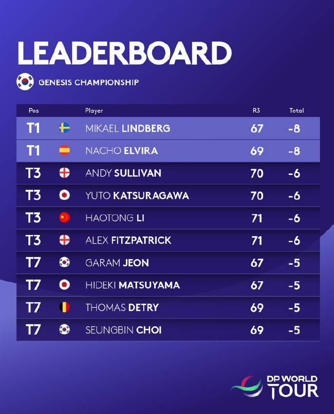 北京時間10月25日,納奇歐·埃爾維拉(Nacho Elvira)與邁克爾·林德伯格(Mikael Lindberg)從擁擠的錦標追趕軍團中突圍而出,并列領先捷尼賽思韓國錦標賽第三輪。賽埃