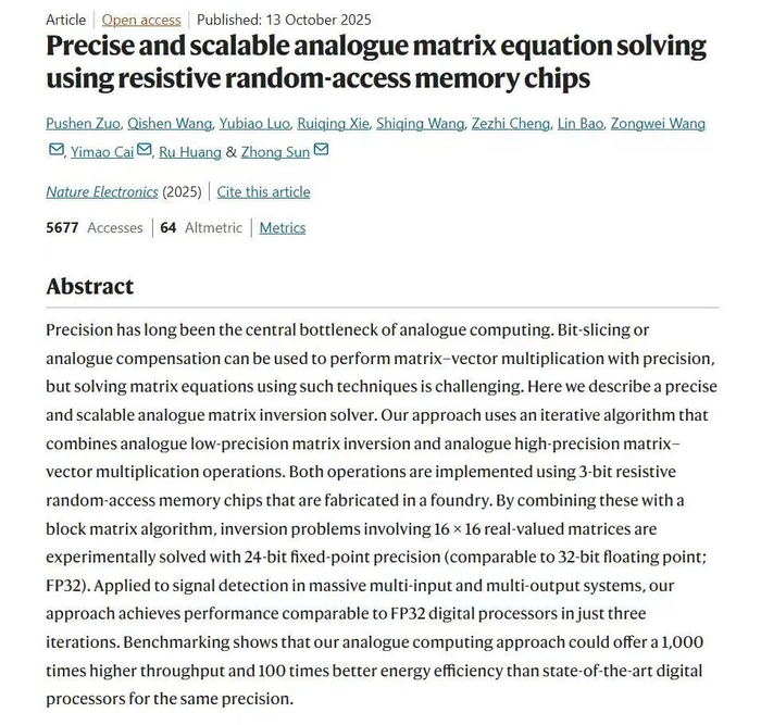 在計(jì)算精度方面,團(tuán)隊(duì)在實(shí)驗(yàn)上成功實(shí)現(xiàn)16×16矩陣的24比特定點(diǎn)數(shù)精度求逆,矩陣方程求解經(jīng)過(guò)10次迭代后,相對(duì)誤差可低至10??量級(jí)。在計(jì)算性能方面,在求解32×32矩陣求逆問(wèn)題時(shí),其算力已超越高端GPU的單核性能;當(dāng)問(wèn)題規(guī)模擴(kuò)大至128×128時(shí),計(jì)算吞吐量更達(dá)到頂級(jí)數(shù)字處理器的1000倍以上,傳統(tǒng)GPU干一天的活,這款芯片一分鐘就能搞定。