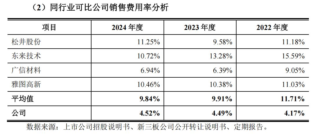 與此同時,報告期內(nèi),金橋德克的銷售費用率分別為4.17%、4.49%和4.52%,明顯低于各同行業(yè)可比公司,也大幅低于同行業(yè)可比公司平均水平的11.71%、9.91%和9.84%。同時,金橋德克的管理費用率分別為3.98%、4.09%和4.51%,同樣明顯低于各同行業(yè)可比公司的管理費用率,也大幅低于同行業(yè)可比公司平均水平的9.72%、8.93%和8.73%。對此,金橋德克在招股書中表示,這都符合公司實際情況。