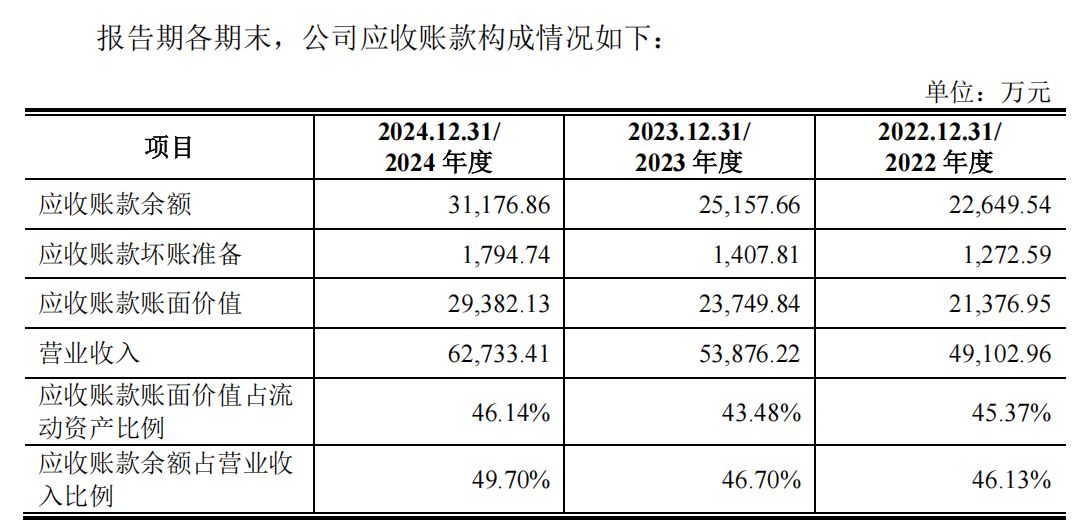 此外,在報告期各期末,金橋德克的應(yīng)收賬款賬面價值分別為2.14億元、2.37億元和2.94億元,占總資產(chǎn)的比例分別為38.24%、34.02%和32.22%,占當期營業(yè)收入的43.53%、44.08%和46.84%。