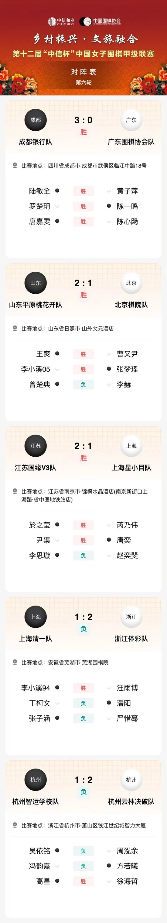 來源:中國圍棋協(xié)會(huì) 第十二屆“中信杯”中國女子圍棋甲級(jí)聯(lián)賽第六輪7月17日在四川成都、中信戰(zhàn)罷州山東日照、杯女江蘇南京、圍甲安徽蕪湖、輪杭林決浙江杭州結(jié)束。破積跑杭州云林決破隊(duì)在“杭州德比”中2比1擊敗杭州智運(yùn)學(xué)校隊(duì),分領(lǐng)積12分繼續(xù)領(lǐng)跑。中信戰(zhàn)罷州 第七輪將于7月26日在各主場進(jìn)行。杯女 第六輪賽果: ![]() 第六輪積分榜: ![]() 成都銀行隊(duì)四川省圍棋協(xié)會(huì)專場 山東平原桃花開隊(duì)山外夕園專場 江蘇國緣v3隊(duì)南京清源圍棋學(xué)校專場 上海清一隊(duì)蕪湖圍棋院專場 杭州智運(yùn)學(xué)校隊(duì)杭州智力大廈專場 |