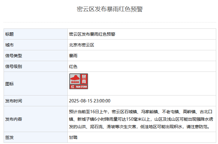 北京密云區(qū)發(fā)布暴雨紅色預(yù)警 — 新京報