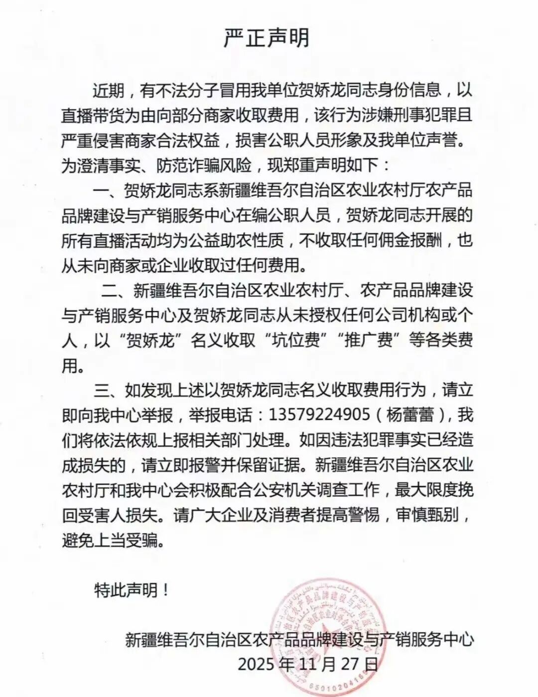她在27日的緊急聲明里說,近期有不法分子冒用“賀嬌龍”名義,以直播帶貨為由向商家收取費(fèi)用?,F(xiàn)嚴(yán)正聲明:賀嬌龍所有直播均為公益助農(nóng),零傭金,從未授權(quán)任何機(jī)構(gòu)收取“坑位費(fèi)”“推廣費(fèi)”,請(qǐng)廣大企業(yè)和消費(fèi)者提高警惕。賀嬌龍還在朋友圈公布了舉報(bào)電話13579224905,提醒如遇冒充她收費(fèi)的行為可立即聯(lián)系舉報(bào)。