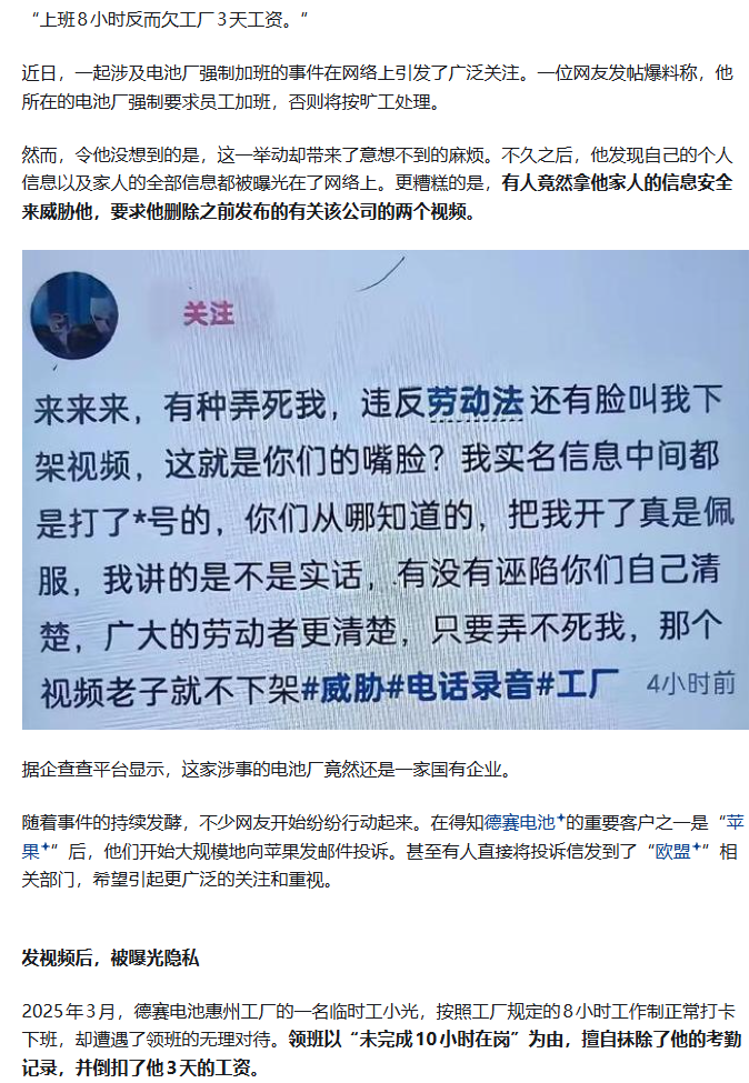 網(wǎng)絡(luò)截圖視頻曝光后迅速在網(wǎng)絡(luò)發(fā)酵,引發(fā)公眾強烈關(guān)注。作為蘋果、華為、OPPO等知名品牌的核心供應(yīng)商,德賽電池的勞工管理問題不僅影響企業(yè)自身形象,更引發(fā)了對整個供應(yīng)鏈勞工權(quán)益保障的質(zhì)疑。據(jù)報道,德賽電池約一半營收來自蘋果訂單,而蘋果公司對供應(yīng)商勞工條件有嚴(yán)格要求,明確禁止"強迫勞動"。