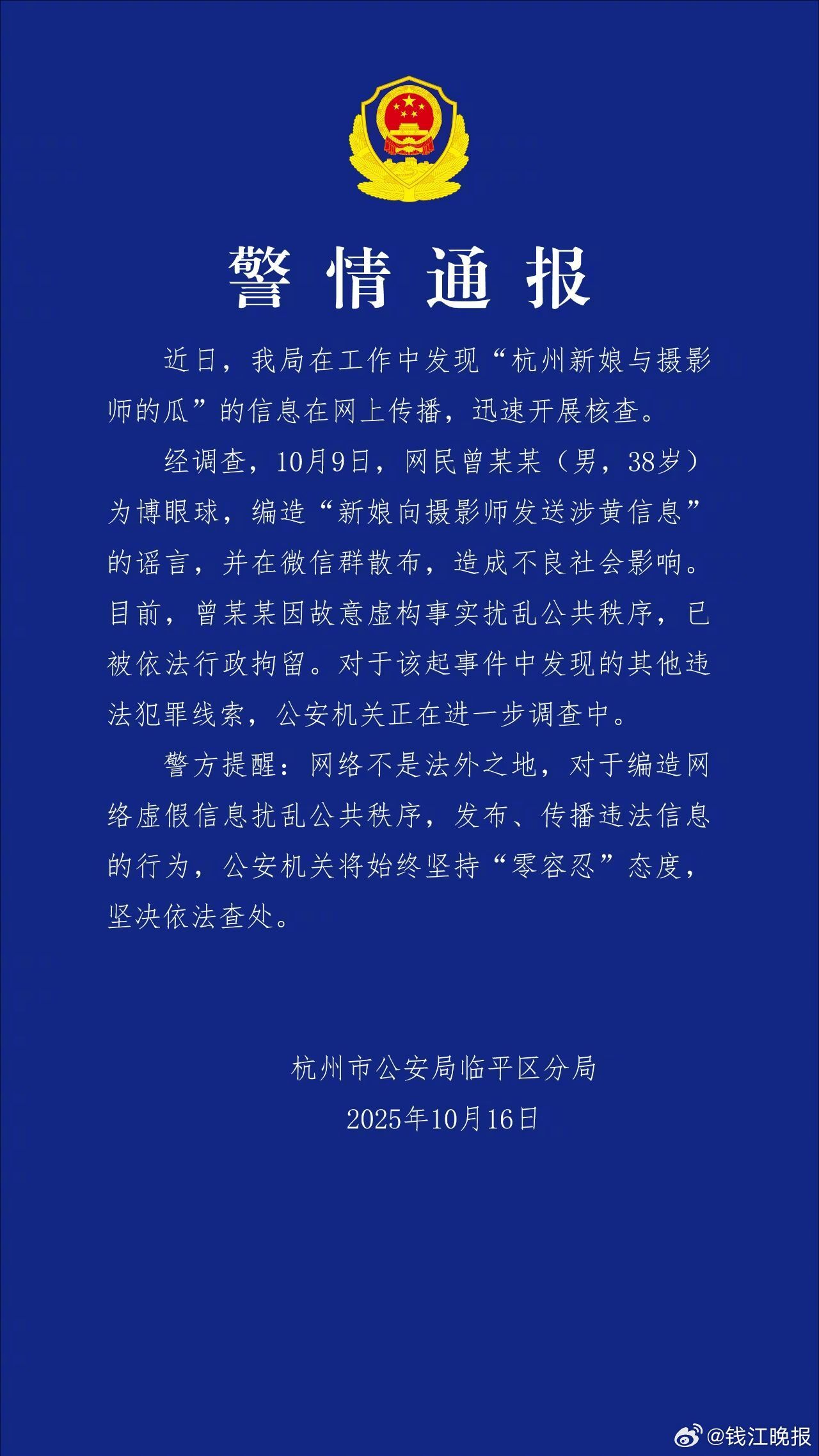 經(jīng)調(diào)查,發(fā)涉10月9日,黃信網(wǎng)民曾某某(男,警方38歲)為博眼球,辟謠被拘編造“新娘向攝影師發(fā)送涉黃信息”的新娘向攝息男謠言,并在微信群散布,影師造成不良社會(huì)影響。發(fā)涉(潮新聞 記者 謝春暉 王逸群)