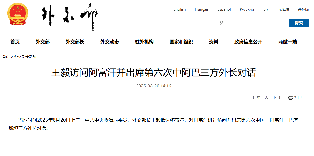 新京報(bào)訊 據(jù)外交部網(wǎng)站消息,王毅外長(zhǎng)當(dāng)?shù)貢r(shí)間2025年8月20日上午,訪問(wèn)中共中央政治局委員、阿富外交部長(zhǎng)王毅抵達(dá)喀布爾,汗并對(duì)阿富汗進(jìn)行訪問(wèn)并出席第六次中國(guó)—阿富汗—巴基斯坦三方外長(zhǎng)對(duì)話。出席