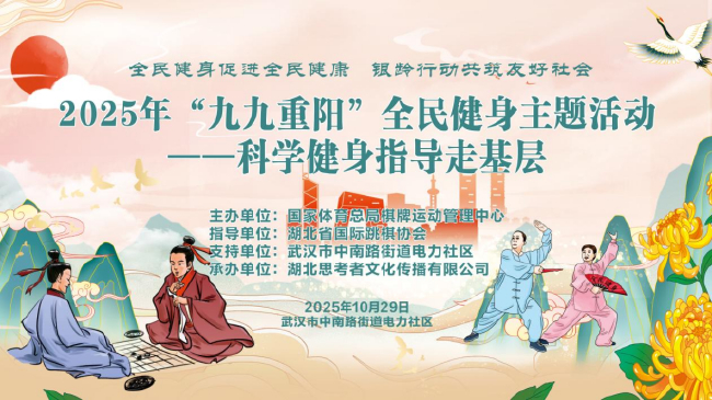 為深入貫徹國家體育總局辦公廳關于組織開展2025年“九九重陽”全民健身主題活動的號召,推動積極老齡觀與健康老齡化理念深入基層,全民10月29日,健身由國家體育總局棋牌運動管理中心主辦的主題走進“科學健身指導走基層”活動在武漢市中南路街道電力社區(qū)成功舉辦。本次活動以“全民健身促進全民健康,活動銀齡行動共筑友好社會”為主題,武漢通過“冠軍+群眾”、電力“理論+實踐”的社區(qū)多元融合模式,為社區(qū)老年人呈現(xiàn)了一場兼具科學內(nèi)涵與人文溫度的九九重陽智力運動盛會。