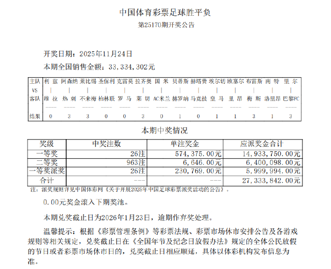 埃爾切2-2皇馬北京時間11月24日,足彩第25170期開獎結果揭曉。本期足彩頭獎開出26注,單注獎金574,375元,本期600萬派獎獎金全部派完,每注多得230,769元,單注共計805,144元