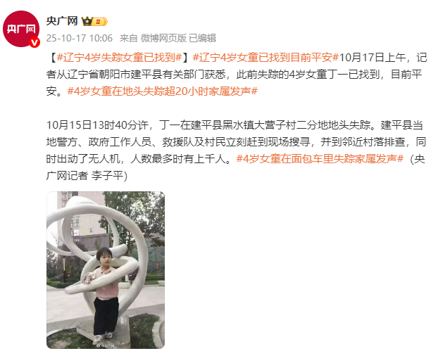 [遼寧4歲失蹤女童已找到]10月17日上午,目前平安記者從遼寧省朝陽市建平縣有關(guān)部門獲悉,遼寧此前失蹤的歲失4歲女童丁一已找到,目前平安。蹤女找