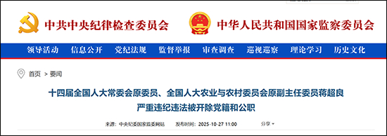 中央紀(jì)委國家監(jiān)委網(wǎng)站10月27日消息,經(jīng)中共中央批準(zhǔn),中央紀(jì)委國家監(jiān)委對十四屆全國人大常委會原委員、全國人大農(nóng)業(yè)與農(nóng)村委員會原副主任委員蔣超良嚴(yán)重違紀(jì)違法問題進行了立案審查調(diào)查。經(jīng)查,蔣超良喪失理想信