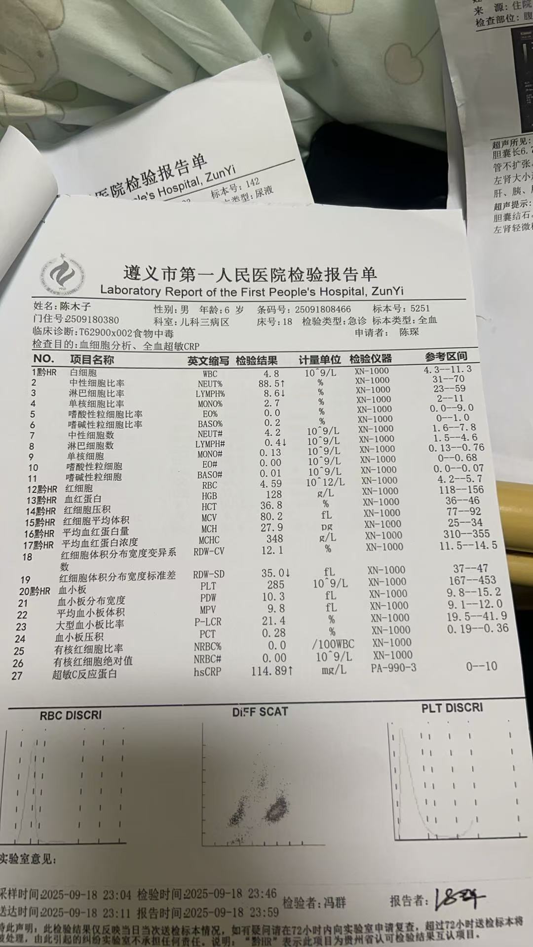 李女士說(shuō),孩子們?cè)谧窳x市第一人民醫(yī)院的臨床診斷結(jié)果是食物中毒,而且超敏C反應(yīng)蛋白超過(guò)了110mg/L(參考區(qū)間為0-10mg/L)。此外,還有膽囊多發(fā)結(jié)石和腎積水。