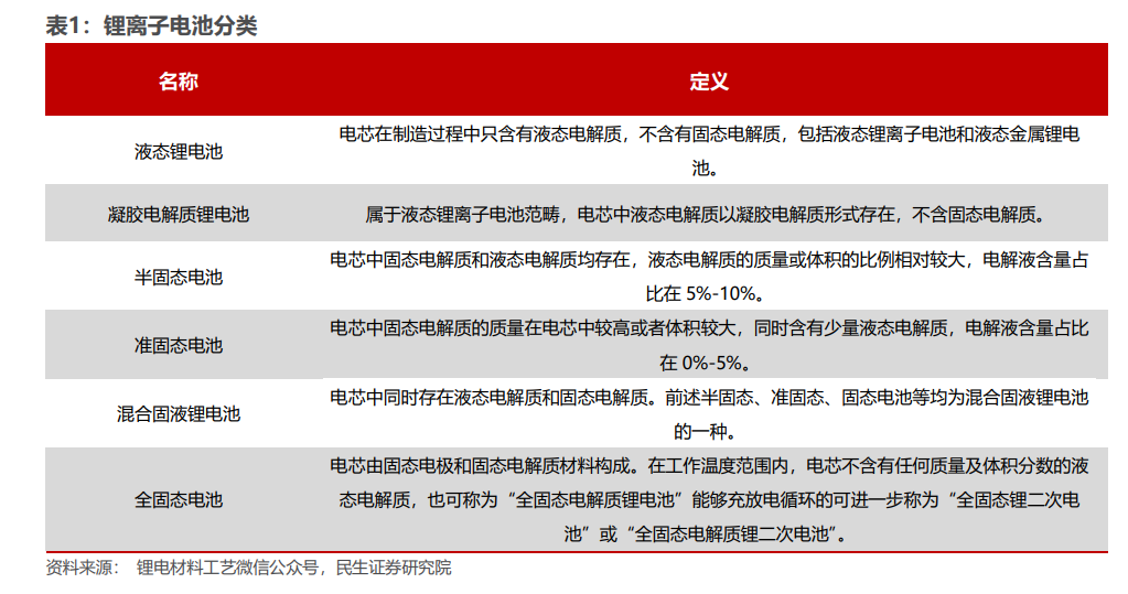根據(jù)液態(tài)電解質(zhì)占電芯材料混合物的質(zhì)量分?jǐn)?shù)分類,電池可細(xì)分為液態(tài) (25%)、半固態(tài)(5%~10%)、準(zhǔn)固態(tài)(0%~5%)和全固態(tài)(0%)四大類,其中半固態(tài)、準(zhǔn)固態(tài)和全固態(tài)3種統(tǒng)稱為固態(tài)電池。