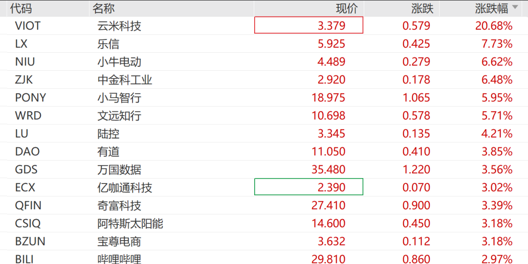 其他熱門中概股方面,云米科技狂飆超20%,樂信漲超7%,小牛電動(dòng)漲超6%,文遠(yuǎn)知行、小馬智行漲超5%,寶尊電商、嗶哩嗶哩等多股漲超3%,理想汽車跌1.48%。