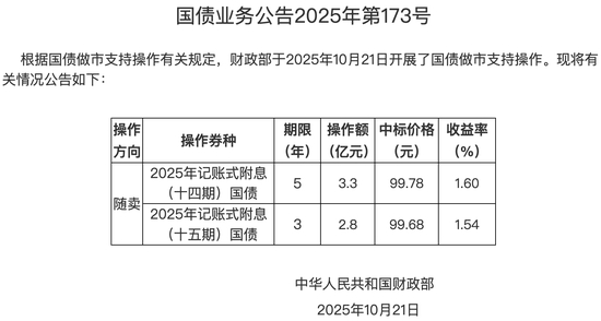 財(cái)政部發(fā)布公告,財(cái)政操作根據(jù)國(guó)債做市支持操作有關(guān)規(guī)定,部于財(cái)政部于2025年10月21日開(kāi)展了國(guó)債做市支持操作。月日