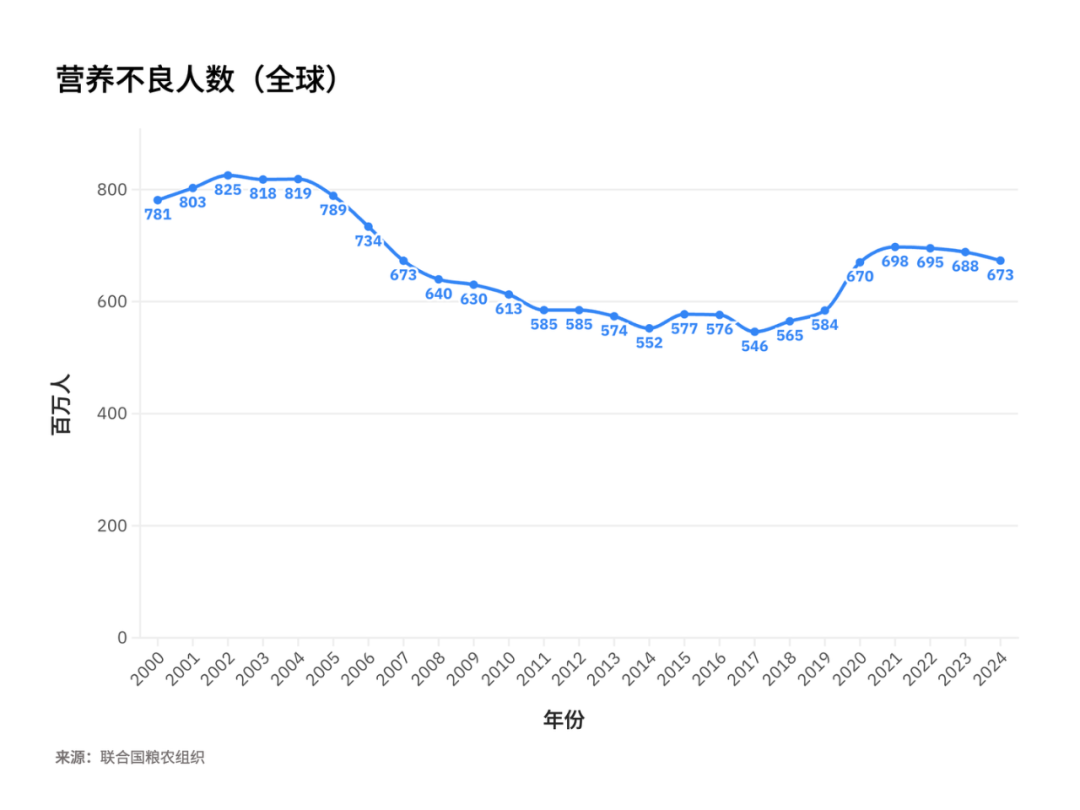 糧農(nóng)組織在其2025年關(guān)于糧食安全的年度報(bào)告中指出,自新冠疫情以來(lái),全球饑餓比例已經(jīng)再次逐步下降,從2022年占世界人口的8.7%降至2024年的8.2%(相當(dāng)于每12人中有1人)。這意味著仍有約7億人面臨饑餓。此外,超過(guò)四分之一、即近23億人去年面臨中度或重度的糧食不安全;在6-23個(gè)月齡的嬰幼兒中,只有34%在維生素和礦物質(zhì)方面達(dá)到最低膳食標(biāo)準(zhǔn)。