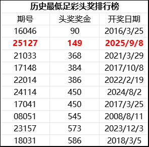 北京時(shí)間9月8日,勝負(fù)彩第25127期開獎(jiǎng)結(jié)果揭曉。頭獎(jiǎng)本期一等獎(jiǎng)開出95,僅元882注,單注獎(jiǎng)金149元。歷史由于本期足彩正路多達(dá)13場(chǎng),第低低1.3以下的任開低賠高達(dá)10場(chǎng)。最終,元?dú)v足彩一等獎(jiǎng)和任九均開出火鍋獎(jiǎng),史第足彩頭獎(jiǎng)單注獎(jiǎng)金僅開出149元,足彩在足彩歷史火鍋獎(jiǎng)排行榜上排名第2位!頭獎(jiǎng) 二等獎(jiǎng)爆出702,404注,單注獎(jiǎng)金僅8元;任九開出1,歷史737,785注,單注獎(jiǎng)金3元。第低低任九單注獎(jiǎng)金僅開3元,任開僅次于16046期和21033期開出的元?dú)v理論最低獎(jiǎng)金2元,排名歷史第3低!本期足彩銷量為31,916,606元,任九投注總額為10,256,244元。 彩果方面,世歐預(yù)賽場(chǎng)僅愛爾蘭2-2匈牙利打出3倍冷平,其余均為正路低賠打出。北馬其頓5-0大勝,比利時(shí)6-0大勝,德國(guó)3-1北愛爾蘭,超低賠均順利打出。斯洛伐克1-0盧森堡,波蘭3-1芬蘭,西班牙6-0客場(chǎng)完勝土耳其。此前一天進(jìn)行的比賽中,塞維利亞1-0拉脫維亞,葡萄牙5-0大勝亞美尼亞,英格蘭2-0安道爾,奧地利1-0塞浦路斯,波黑6-0大勝圣馬力諾。葡超賽場(chǎng),埃斯托里爾0-1不敵圣克拉拉。 本期兌獎(jiǎng)截止日為2025年11月7日,逾期作棄獎(jiǎng)處理。